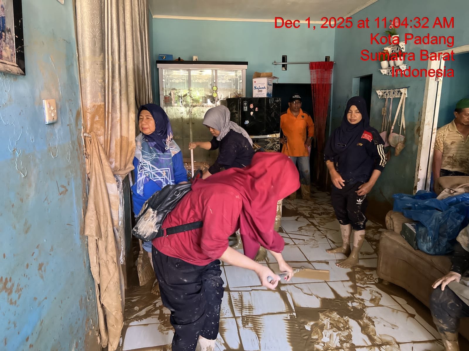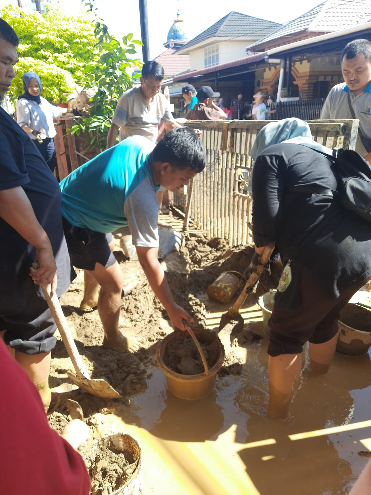 Sebagai bagian dari solidaritas dan kepedulian, dilakukan gotong royong di kediaman yang terdampak banjir. Para pegawai Balitbang bersama-sama membersihkan rumah dan lingkungan sekitar yang terdampak lumpur serta genangan. Kegiatan ini dilakukan sebagai wujud nyata bahwa nilai kebersamaan, peduli dan saling mendukung tetap dijunjung tinggi — bukan hanya di tempat kerja, tetapi juga saat ada rekan yang menghadapi musibah.