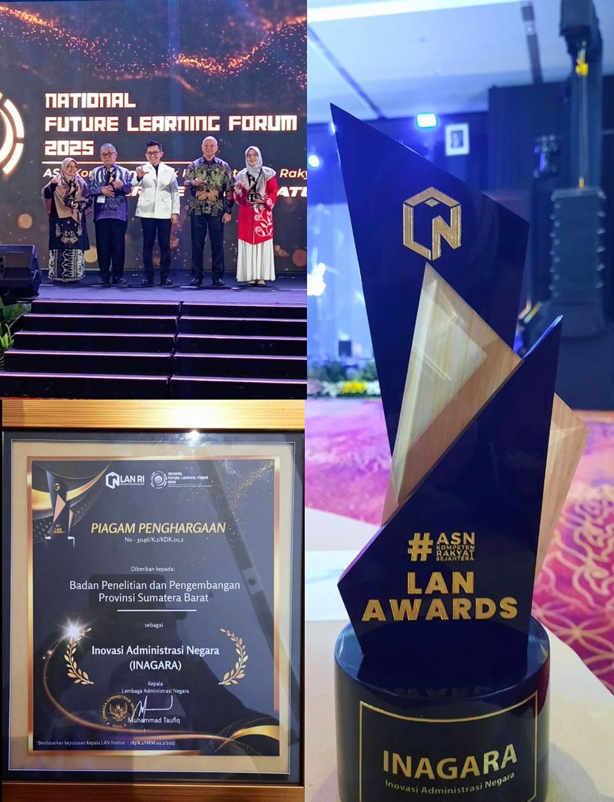 Jakarta, 3 Desember 2025 — Badan Penelitian dan Pengembangan Provinsi Sumatera Barat meraih penghargaan dari Lembaga Administrasi Negara (LAN) RI sebagai Unit Pelaksana Pembinaan Inovasi yang dinilai memiliki komitmen tinggi dalam mendorong penguatan ekosistem inovasi administrasi negara. Penghargaan tersebut diberikan pada ajang tahunan National Future Learning Forum dan LAN Award yang diselenggarakan di Hotel Bidakara, Jakarta.